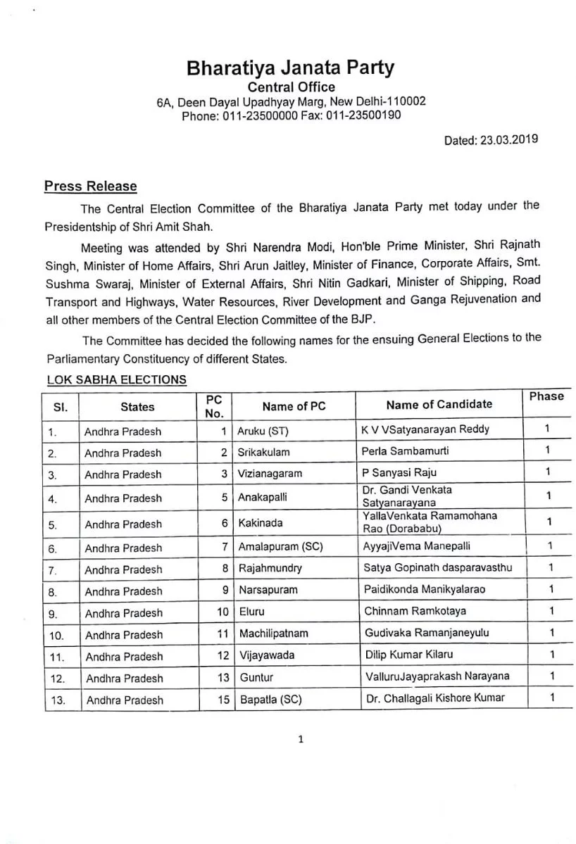 भाजपा की पहली सूची में 184 नाम शामिल हैं। गांधीनगर से आडवाणी की जगह भाजपा अध्यक्ष