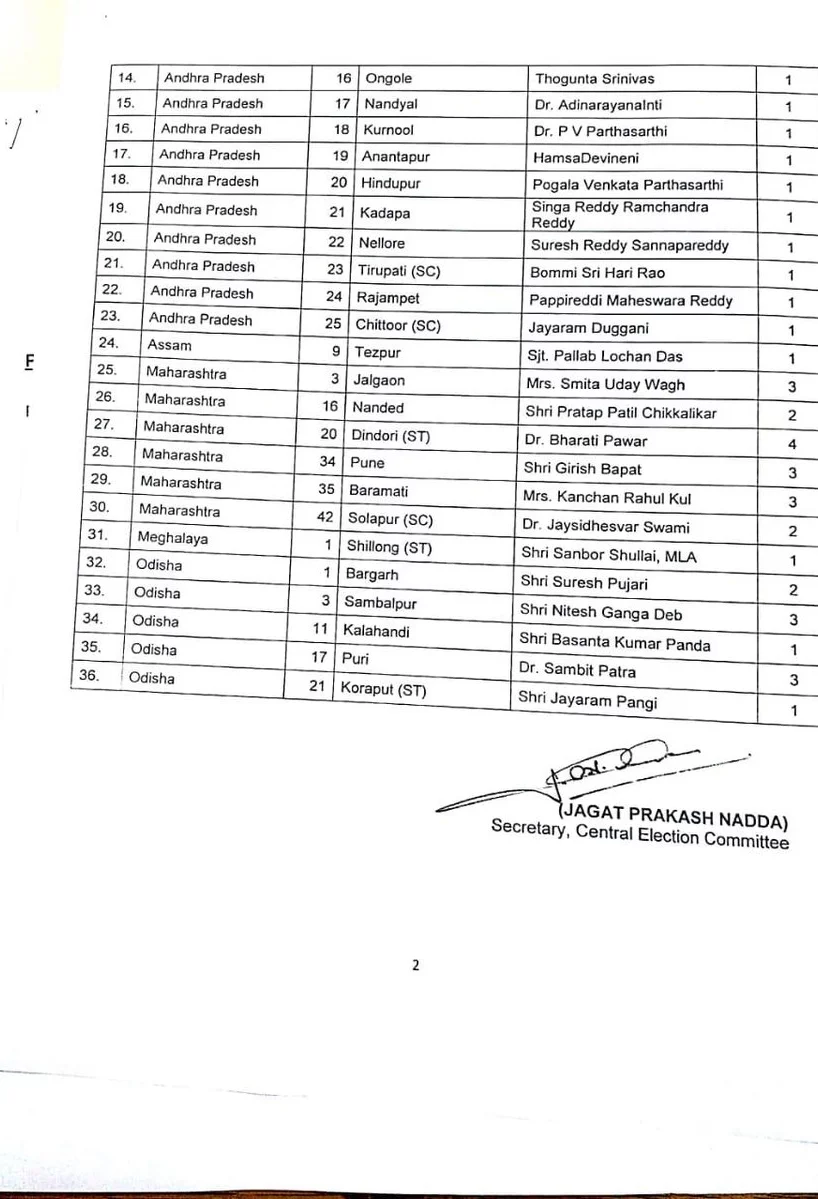 पार्टी ने ओडिशा (5), महाराष्ट्र (6), असम (1), मेघालय (1) और आंध्र प्रदेश (23) के उम्मीदवारों के नामों