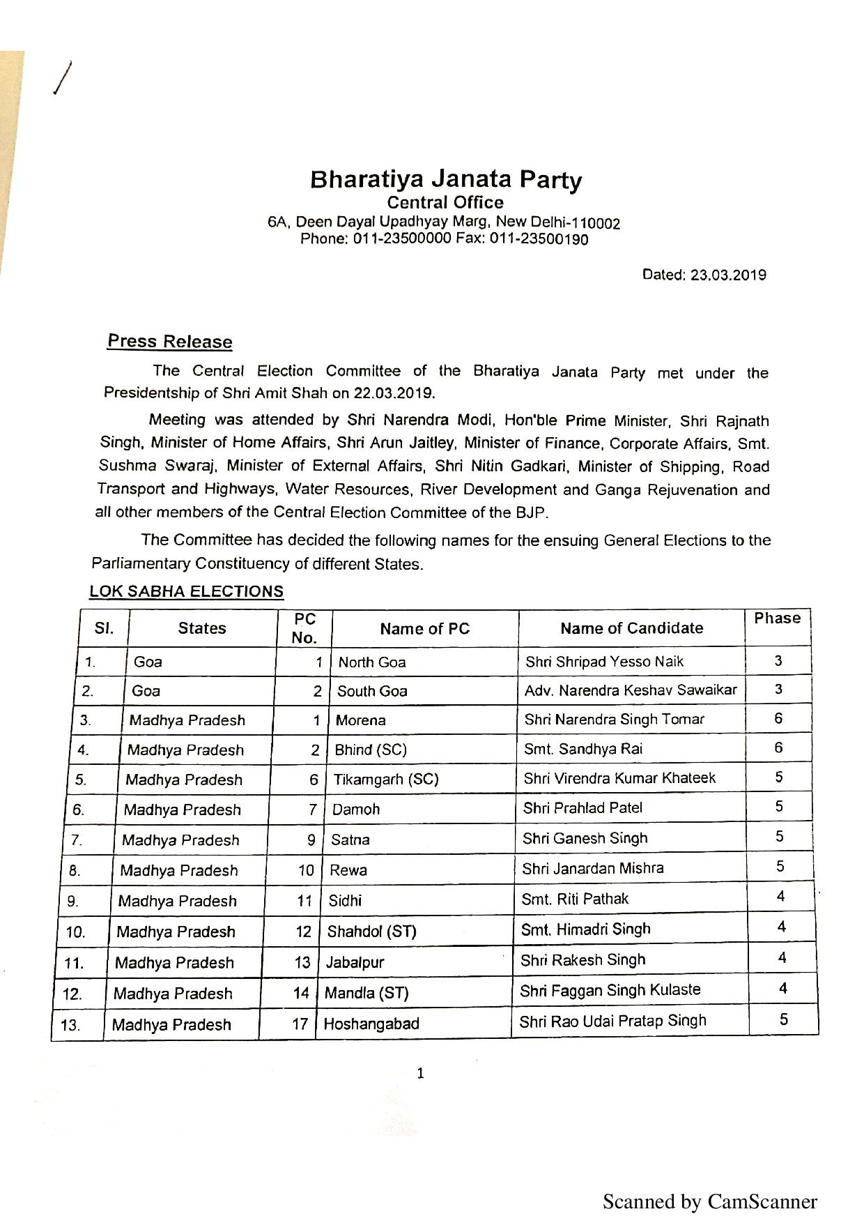 मध्य प्रदेश से भाजपा उम्मीदवार : मुरैना- नरेंद्र सिंह तोमर, रीवा से जनार्दन मिश्रा, जबलपुर से राकेश सिंह, टीकमगढ़ से वीरेंद्र कुमार खटीक, दामोह से प्रह्लाद पटेल, सतना से गणेश सिंह, सिधी से रीती पाठक, शहडोल से हिमाद्रि सिंह, मंडला से फग्गन सिंह कुलस्ते, होशंगाबाद से राव उदय प्रताप सिंह, भींड से संध्या राय, उज्जैन से अनिल फिरोजिया, मंदसौर से सुधीर गुप्ता, खांडवा से नंदकुमार सिंह चौहान, बेतुल से दुर्गादास उईके को टिकट दिया गया है।