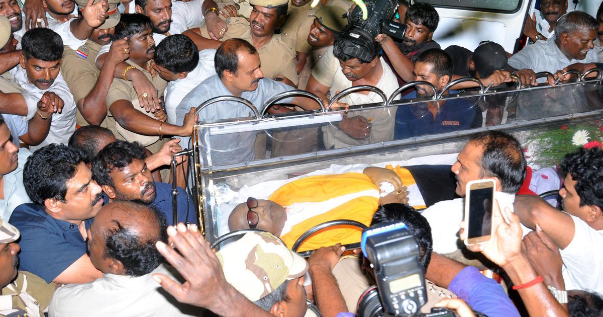 को श्रद्धांजलि देने के लिए हजारों की संख्या में नेतागण व समर्थक चेन्नई के