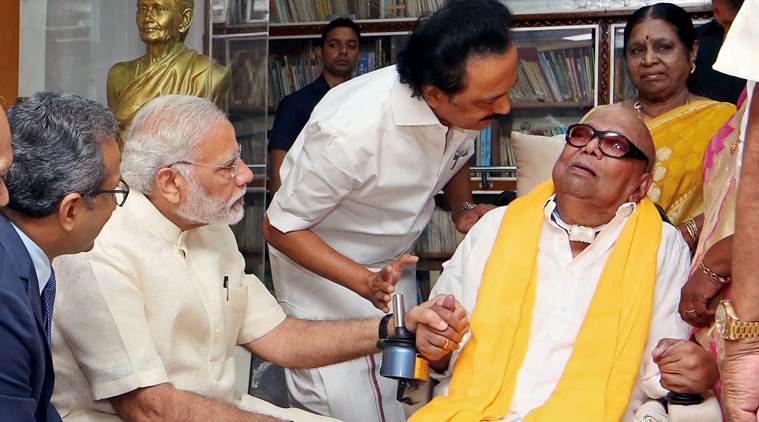 नरेंद्र मोदी के साथ मौजूद हैं। राज्यसभा और लोकसभा में डीएमके प्रमुख करुणानिधि