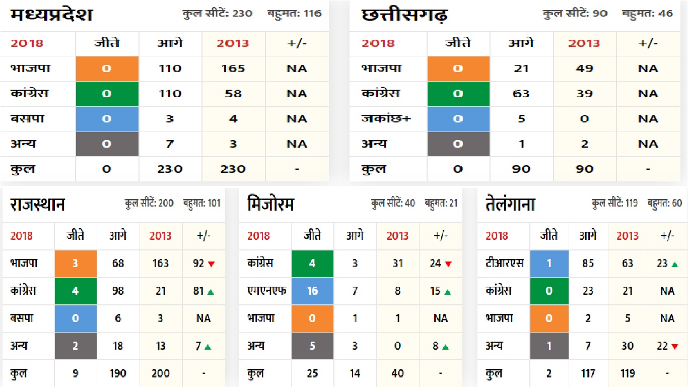 विधानसभा चुनाव परिणाम 2018 LIVE: बीजेपी-कांग्रेस में कांटे की टक्कर,दोनों पार्टी में तनाव, मध्यप्रदेश, राजस्थान और छत्तीसगढ़ में कांग्रेस फिर मजबूत ,बहुमत से पहले अटक सकती है बीजेपी की सुई !