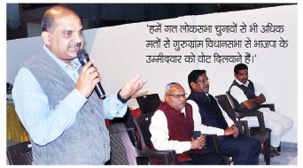 हमें गत लोकसभा चुनावों से भी अधिक मतों से गुरुग्राम विधानसभा से भाजपा के उम्मीदवार को वोट दिलवाने हैं। गत चुनावों में गुरुग्राम विधानसभा से एक लाख दस हजार वोटों से बढ़त थी, जो कि इस बार डेढ़ लाख से अधिक होनी चाहिए। इसी तरह विधानसभा में