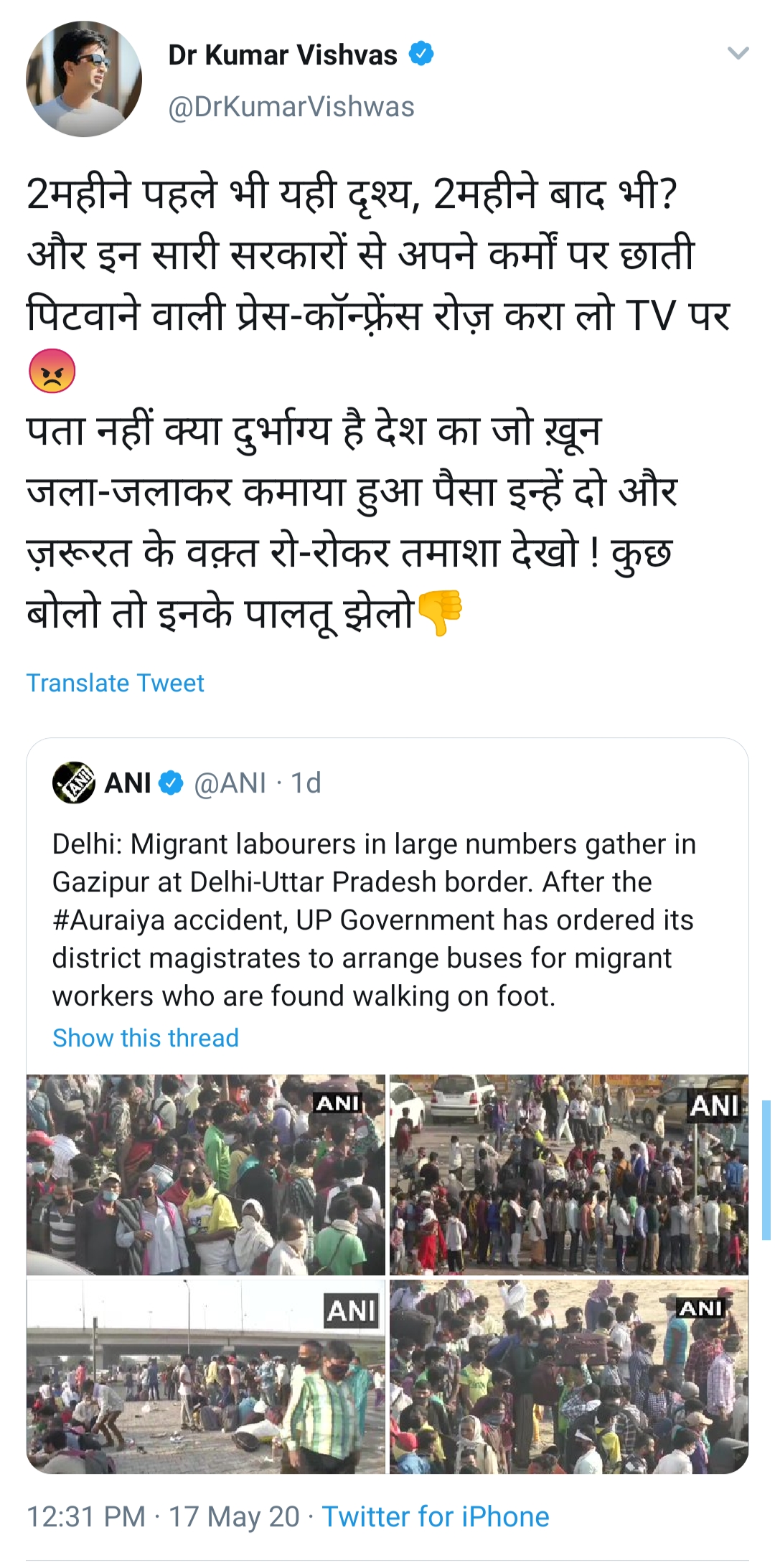 दिल्ली-UP बॉर्डर पर मजदूरों को परेशान देखकर भड़के कुमार विश्वास बोले इन सरकारों से छाती पिटवाने वाली प्रेस कॉन्फ्रेंस रोज करावा लो !